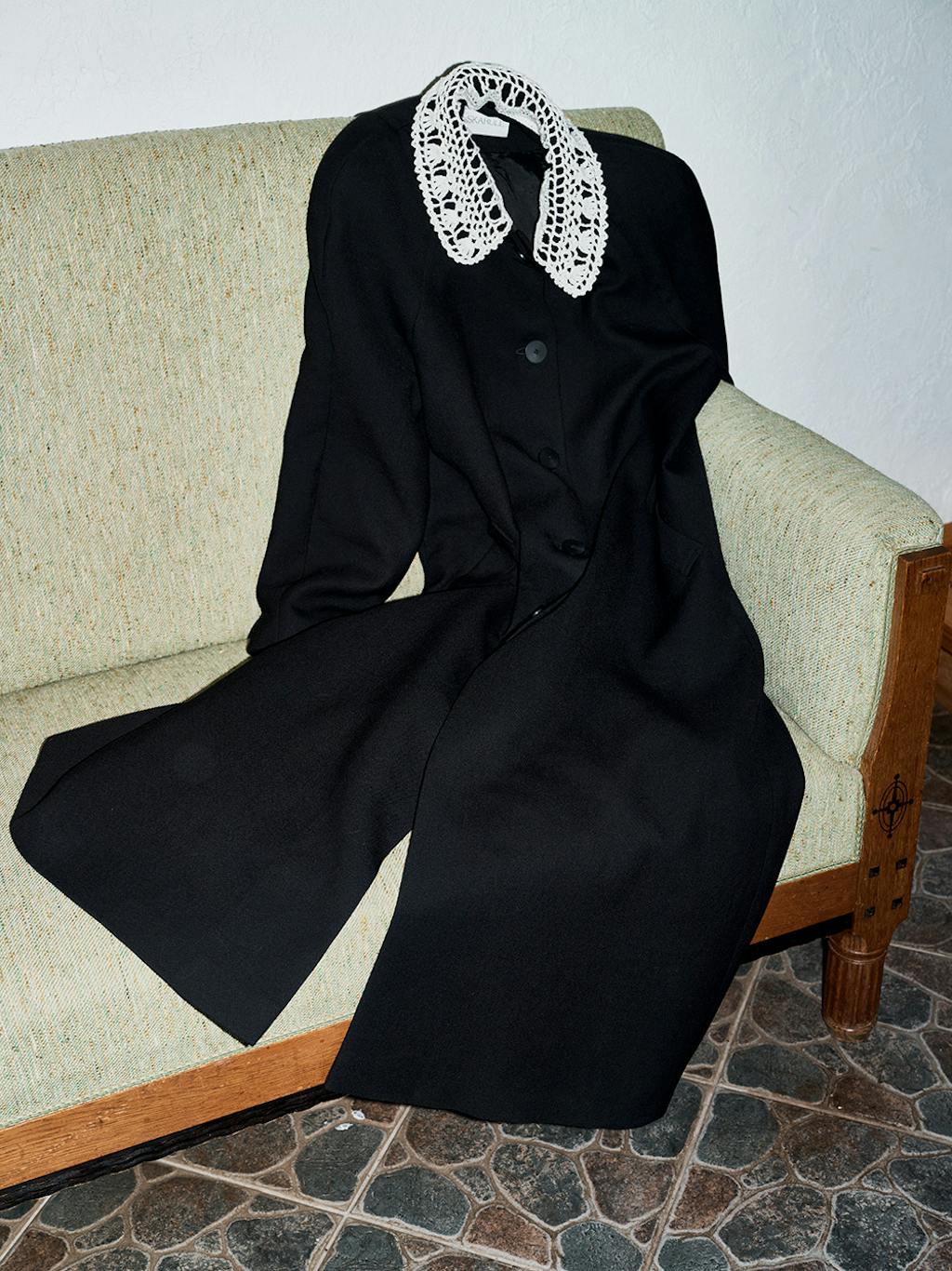 In such a way, +371 arrives in the form of a crumbled and syntactically broken-up visual and patterned language that is once again pieced together. These loose, body non-fitting, and slightly old-ish looks are reinforced with elements sewn or accessories made from traditional crafts techniques such as knitting and crocheting. Through revisiting the craft techniques experienced by the designer in her childhood, +371 communicates conditions and experiences, relations and feelings of the making. It touches upon the relationship between the designer and a craftswoman, between the designer and a wearer, and those between the wearer and their ‘audience’.