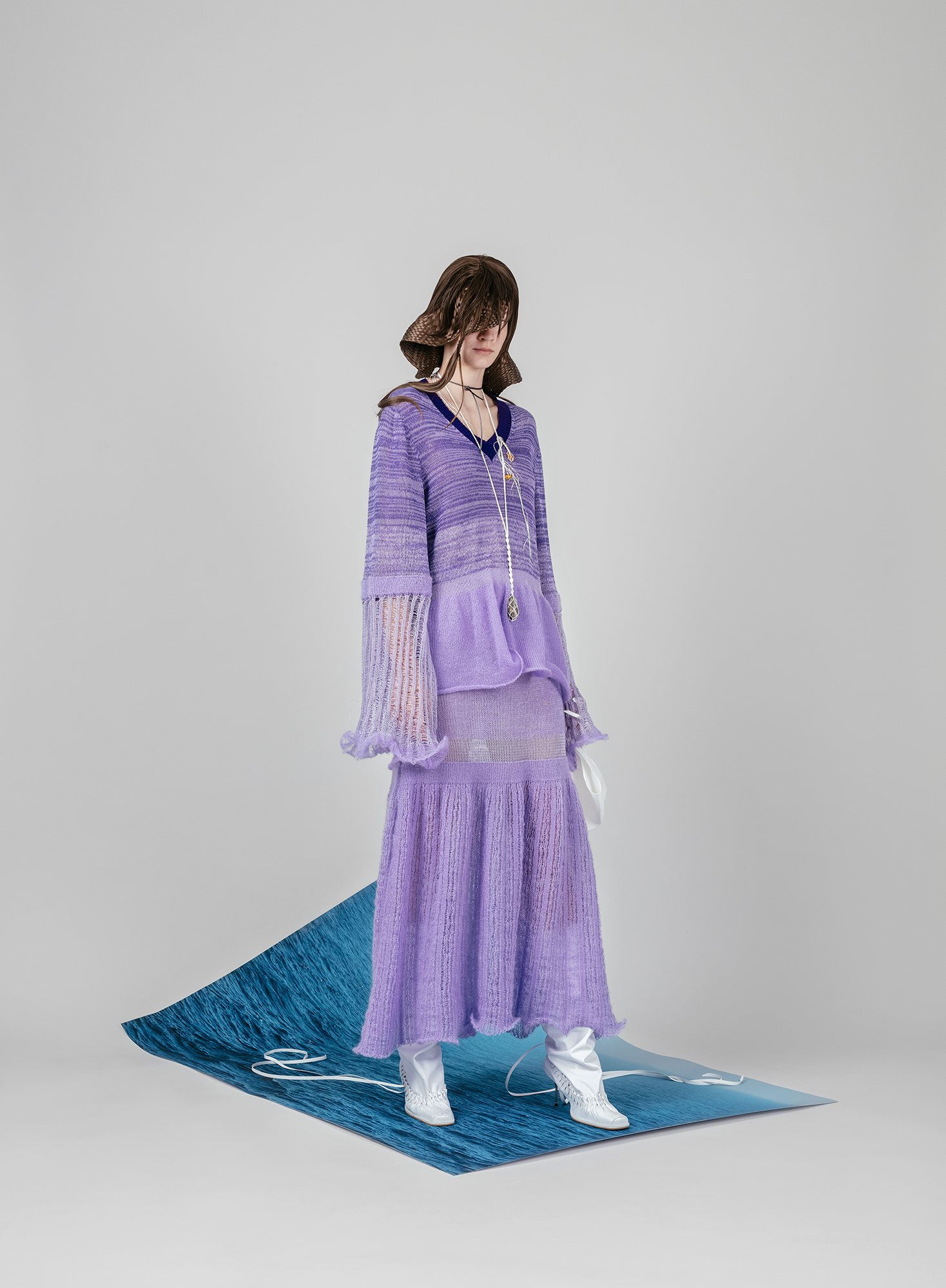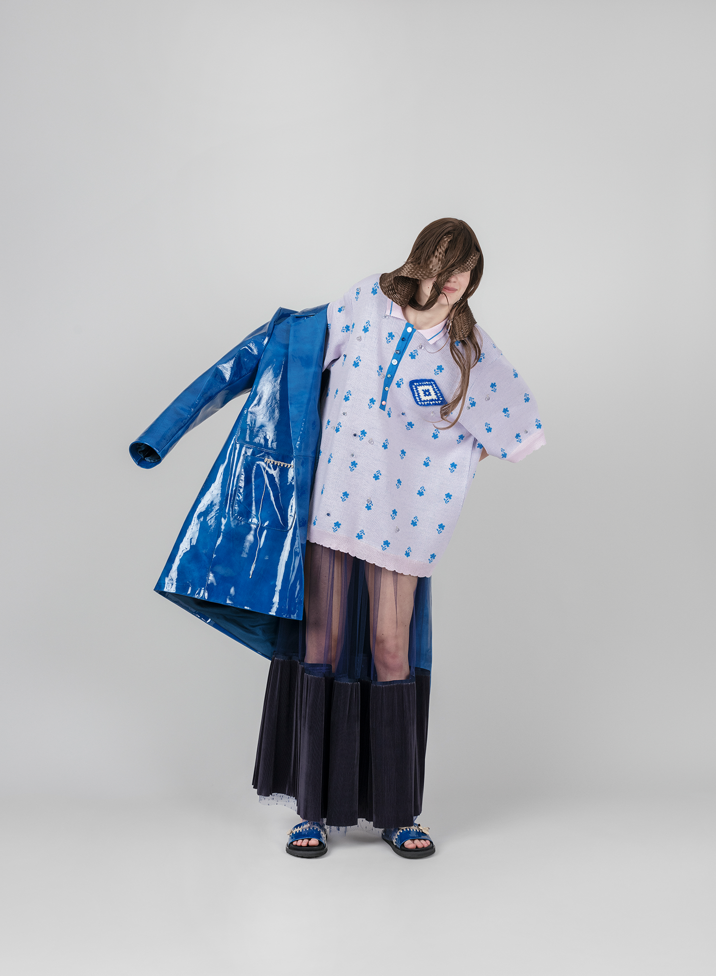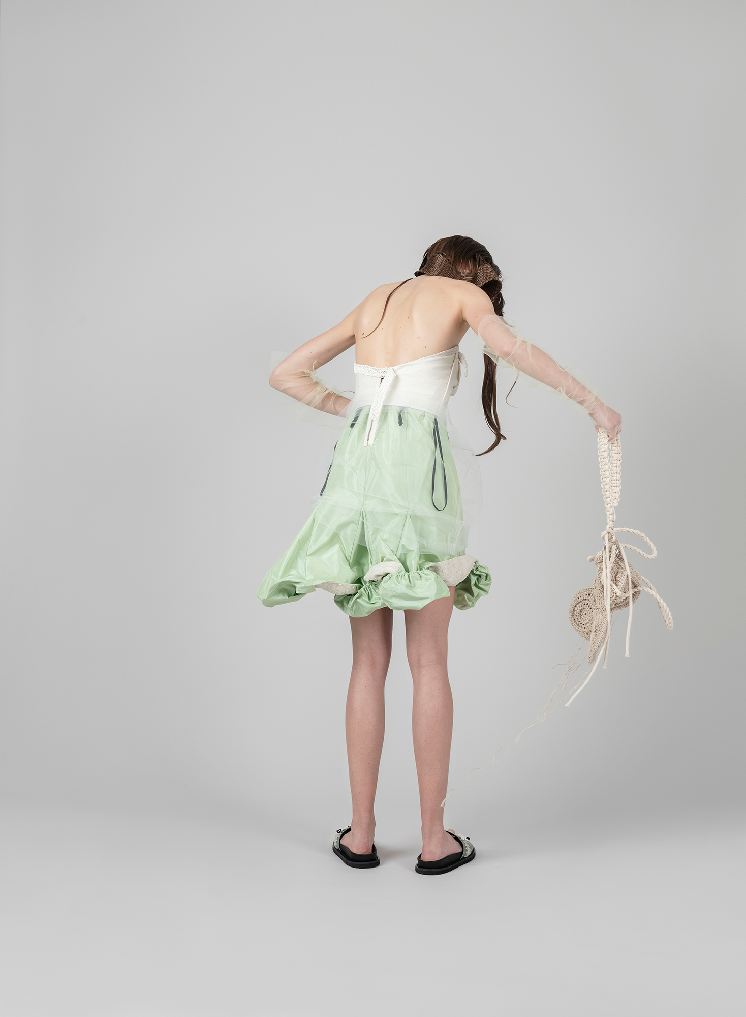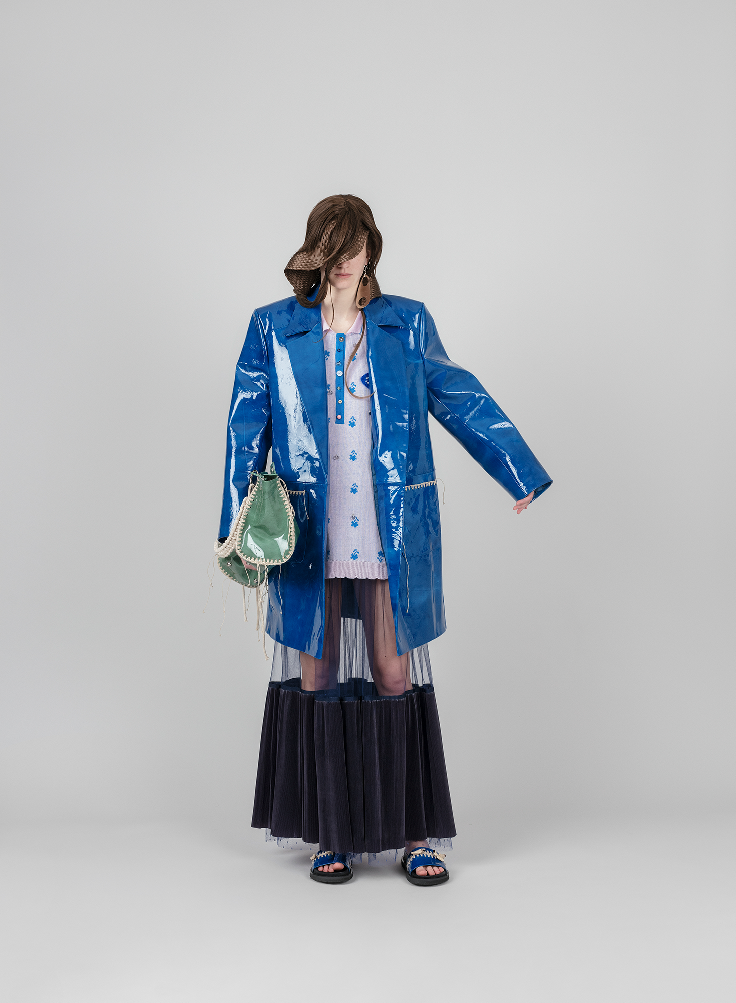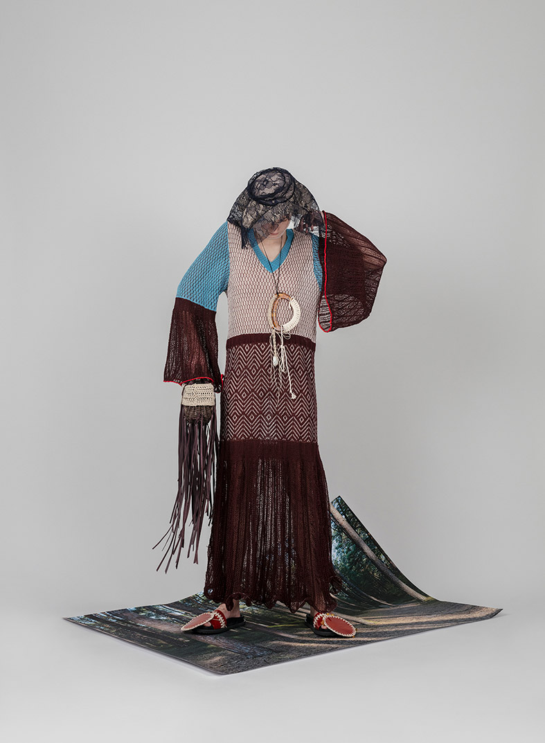 In such a way, +371 arrives in the form of a crumbled and syntactically broken-up visual and patterned language that is once again pieced together. These loose, body non-fitting, and slightly old-ish looks are reinforced with elements sewn or accessories made from traditional crafts techniques such as knitting and crocheting. Through revisiting the craft techniques experienced by the designer in her childhood, +371 communicates conditions and experiences, relations and feelings of the making. It touches upon the relationship between the designer and a craftswoman, between the designer and a wearer, and those between the wearer and their ‘audience’.