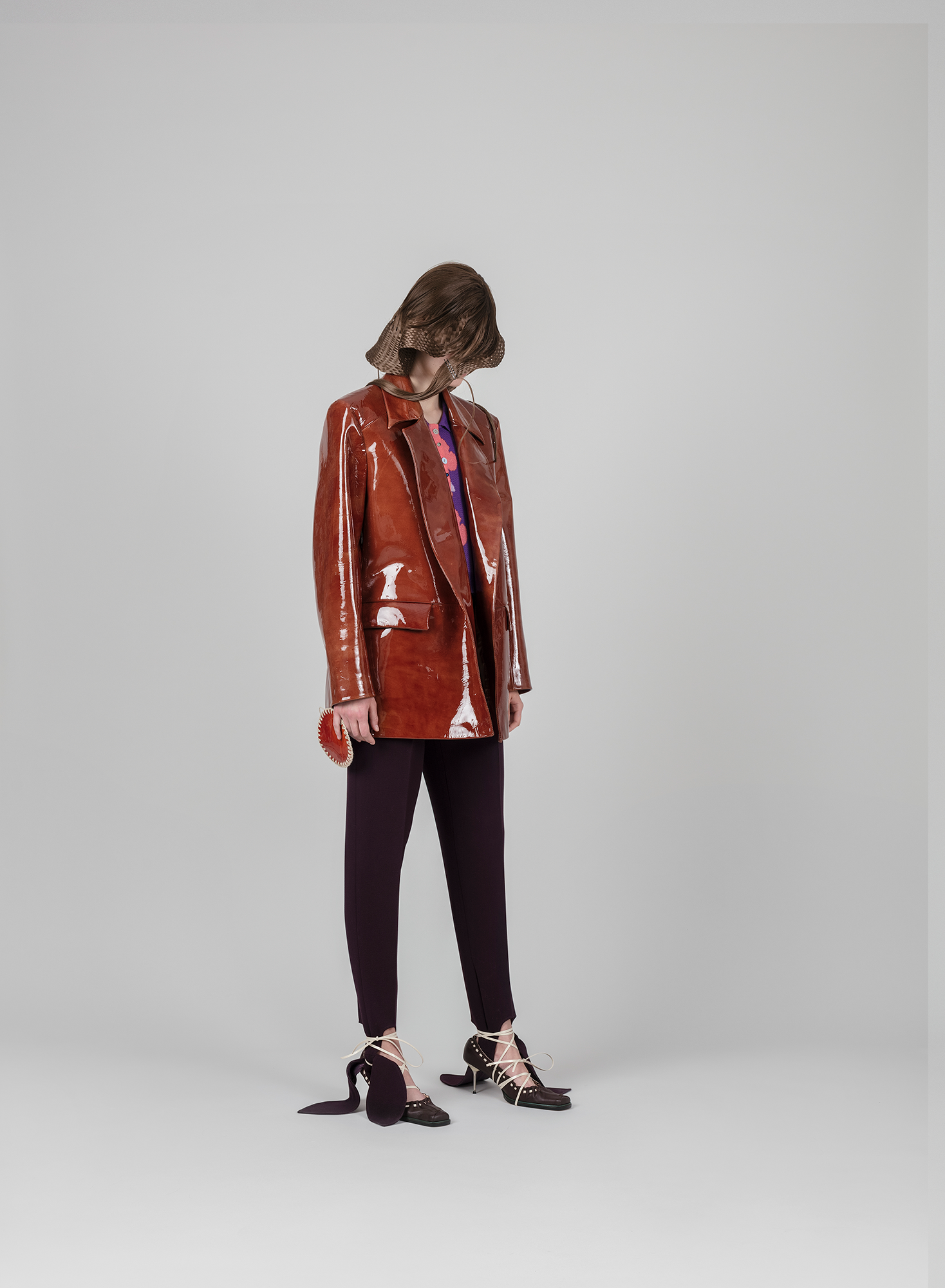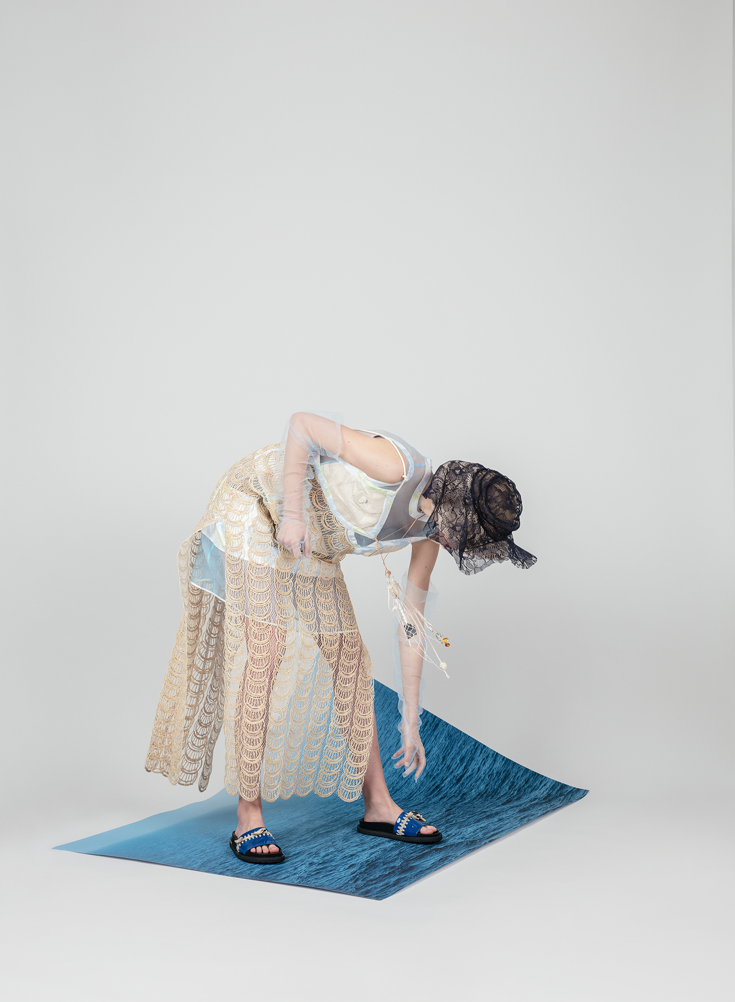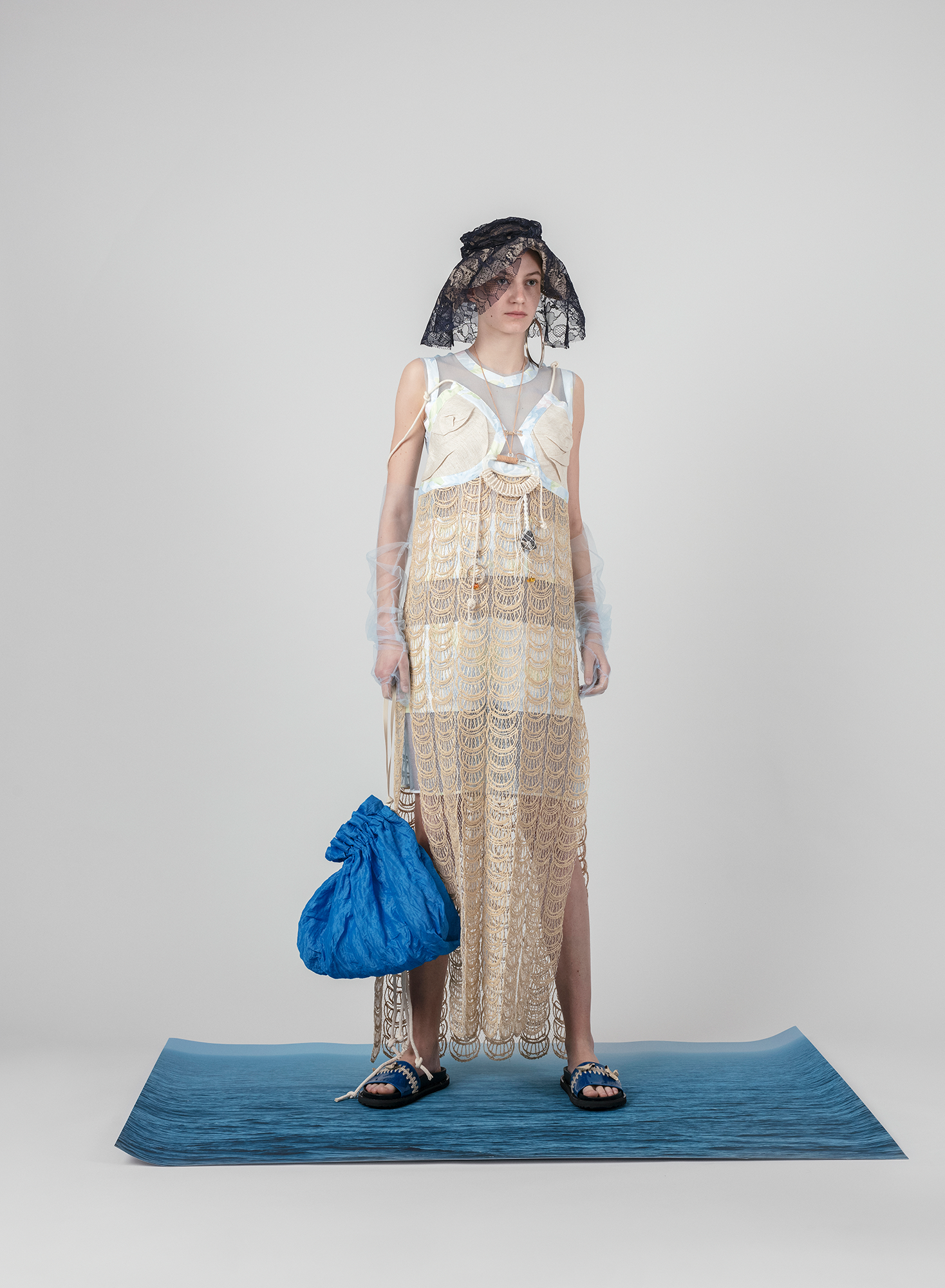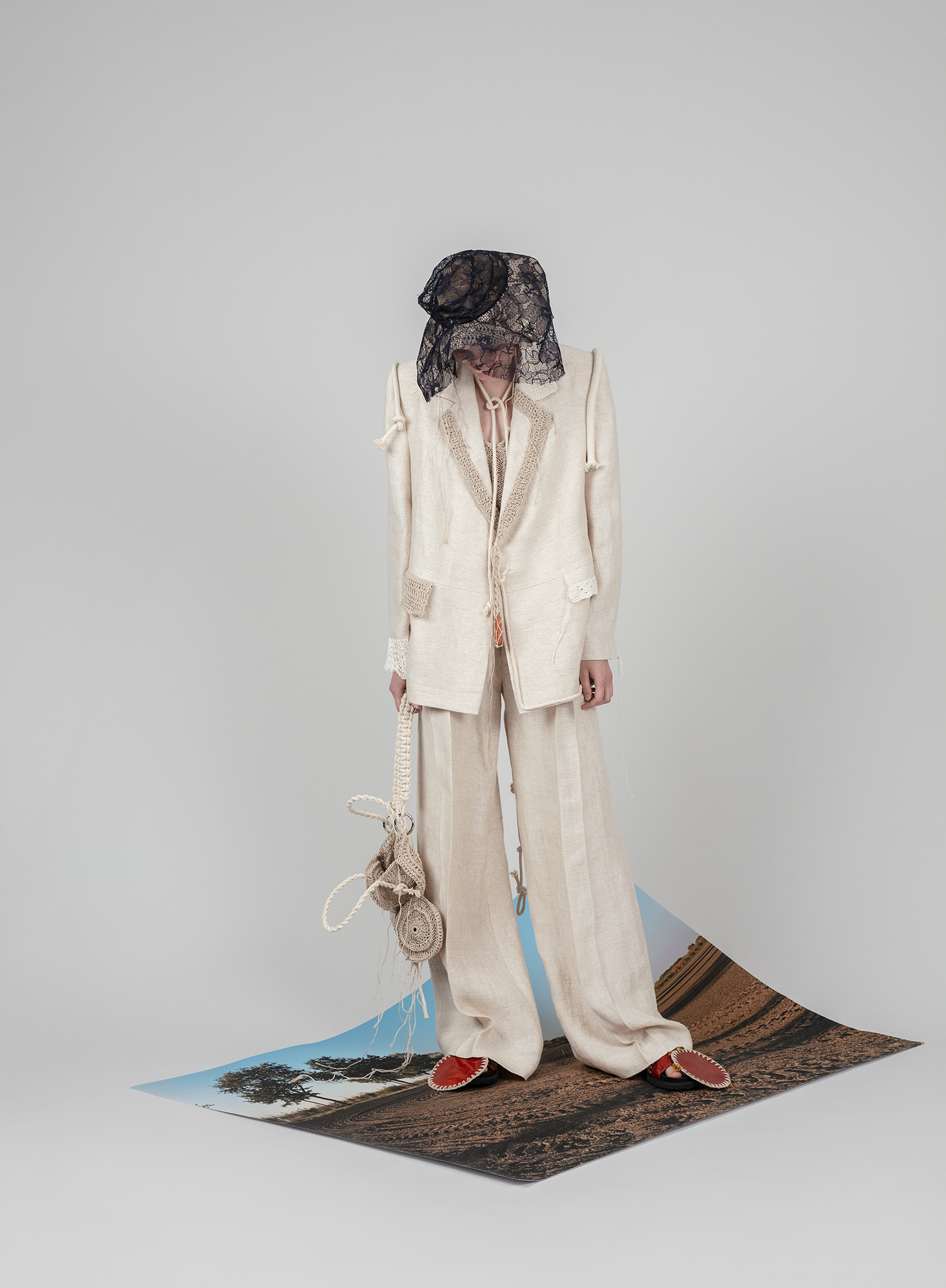 In such a way, +371 arrives in the form of a crumbled and syntactically broken-up visual and patterned language that is once again pieced together. These loose, body non-fitting, and slightly old-ish looks are reinforced with elements sewn or accessories made from traditional crafts techniques such as knitting and crocheting. Through revisiting the craft techniques experienced by the designer in her childhood, +371 communicates conditions and experiences, relations and feelings of the making. It touches upon the relationship between the designer and a craftswoman, between the designer and a wearer, and those between the wearer and their ‘audience’.